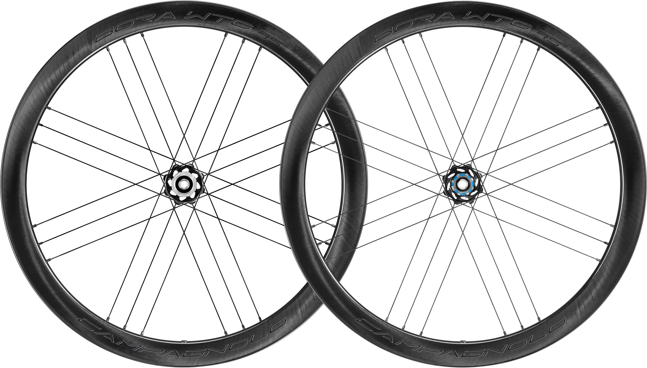 Campagnolo introduces the first aerodynamic Disc Brake wheel with a 45 mm profile, designed to appeal to a broader customer base. The design of the rim enables maximum aerodynamic penetration, and at certain angles, the wind can actually become a valuable ally to the rider. The wheel features carbon rims with a unidirectional aerodynamic finish, new aerodynamic aluminium hubs, and the ceramic USB cup-and-cone bearing system: every design choice has been made with a view to optimising performance. The profile of the rim, which has an internal diameter of 19 mm, corresponds perfectly with 23 mm, 25 mm and 28 mm tyres. In addition, with the 2-Way Fit version, Campagnolo offers its tried-and-tested technology with full compatibility with clincher and tubeless tyres. While the key purpose of these wheels is to deliver extreme performance, safety is also guaranteed thanks to the G3 spoking system with double spokes on the left of the front wheel, to ensure balanced and safe braking in all conditions. Available versions: dark label, Campagnolo freewheel hub, HG or XDR.