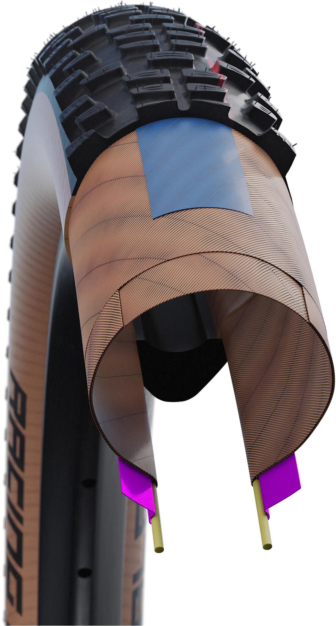 With the new Super Race construction, Schwalbe is setting new standards in suppleness – no other carcass glides so silky smooth over the ground, and thus providing traction, like Super Race does. The patented turn-up construction is characterized by an exceptionally light and supple material mix. The tread is protected by a light protective insert and two carcass layers. The side walls are protected from cuts and snakebites by three carcass layers.